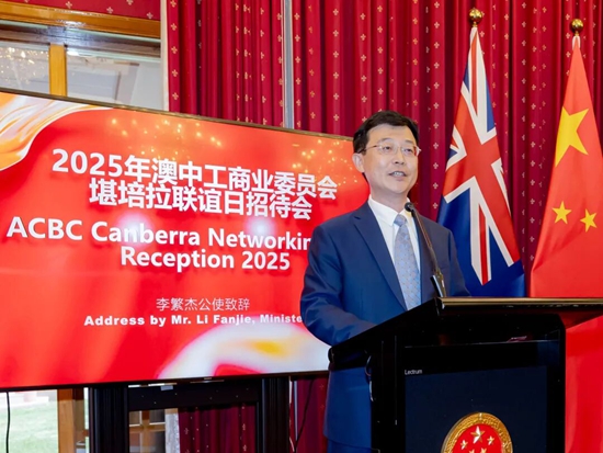 人民網堪培拉10月31日電 10月29日晚,中國駐澳大利亞大使館舉辦2025年澳中工商業委員會(ACBC)堪培拉聯誼日招待會,中國駐澳大利亞大使館公使李繁杰出席活動并致辭。 中國駐澳大利亞大使館公使