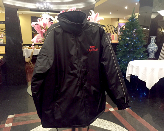 魏基成在新聞會現場展示的慈善冬衣樣品(攝影 馬小龍)