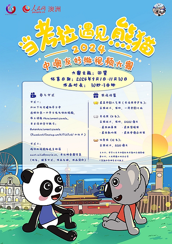 “當考拉遇見熊貓——中澳友好微視頻大賽”由中國駐布里斯班總領館主辦、人民網澳大利亞公司承辦。今年大賽的主題是“回望”,邀請中澳青年及歷屆參賽選手,通過拍攝和制作短視頻,回顧并展示中澳兩國之間深厚的友誼。